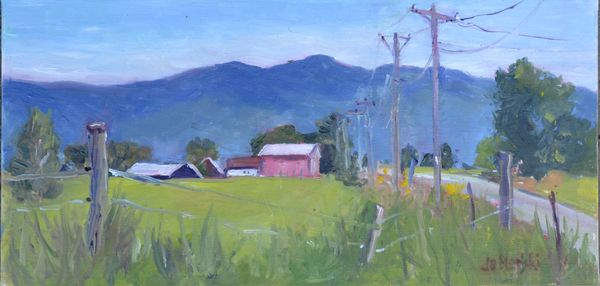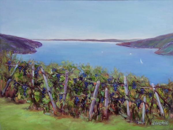 Barbara loves to capture the beauty of landscapes in real-time. My work reflects the vibrant colors and natural light of the locations I visit. The scene is taken from Route 12 at the 1898 red barn overlooking Canandaigua Lake. 'Spirit of Canandaigua" 20"x 24" oil.