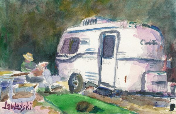 Barbara loves to camp in the mountains as well as near a lake or seashore. Pictured is a small watercolor of Barbara's "Zen Den".... alias name for her 17-foot 2007 Casita Travel Trailer. She traverses the country with her Silky Terrier, Jessie, to plein air paint and vacation. She has traveled to numerous national parks, the Western, Southern and Northeast States. "My Campsite " 6"x8" watercolor.
