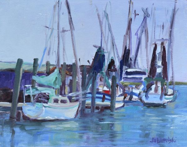 Standing on the docks of Shem Creek, Barbara painted the boats that were